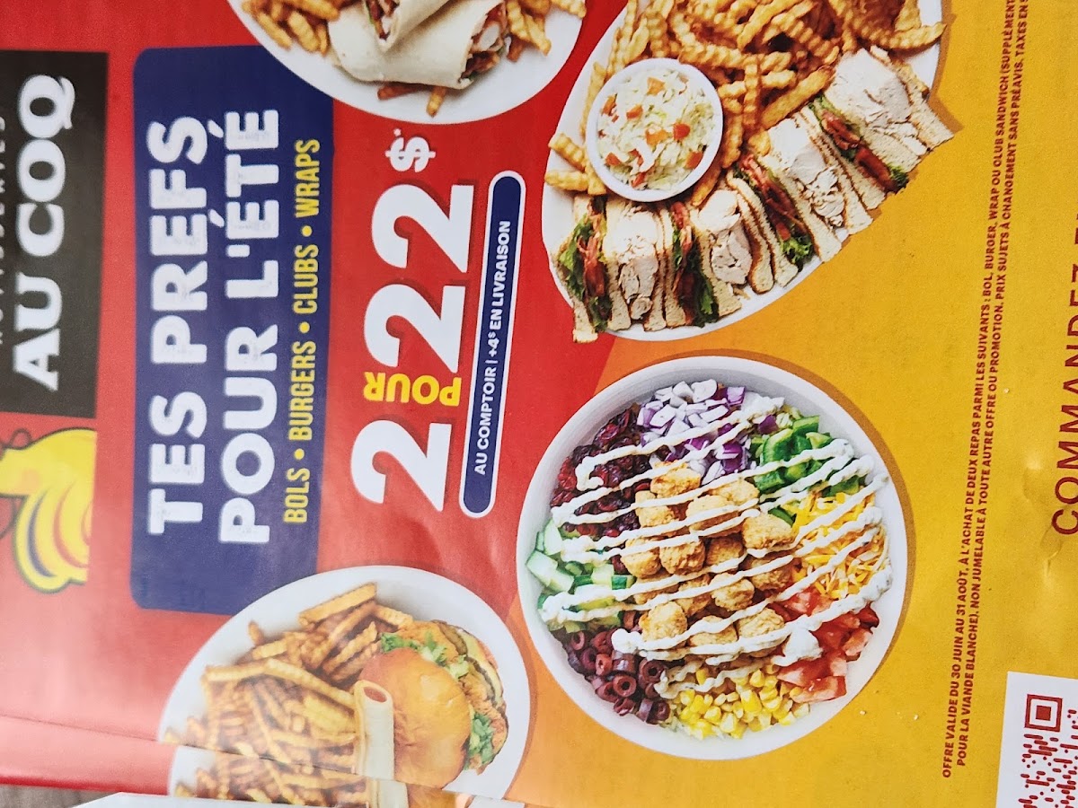 If you're in the mood for something more classic, don't miss the Cuisse De Poulet (Chicken Leg Meal)—tender chicken served with fries, sauce, bread, and coleslaw for CA$22.28. You can also indulge in their Wrap Viande Blanche—a mouthwatering roasted chicken tortilla filled with crispy lettuce, juicy tomatoes, bacon, and homemade mayonnaise, accompanied by fries, gravy, and coleslaw for only CA$25.78. Each dish is crafted with quality ingredients designed to invigorate your taste buds!